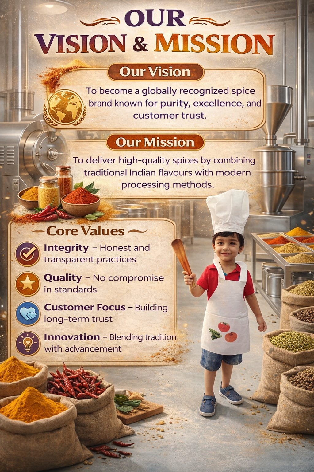To deliver high-quality spices by combining traditional Indian flavours with modern processing methods.